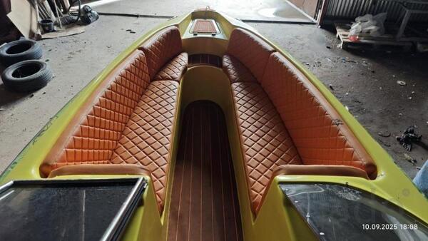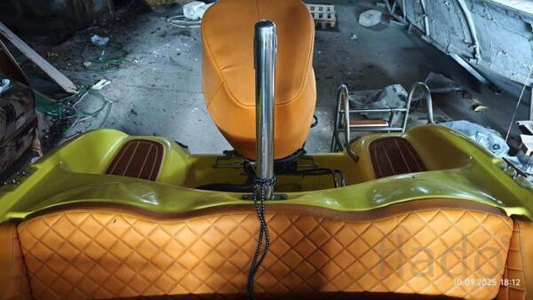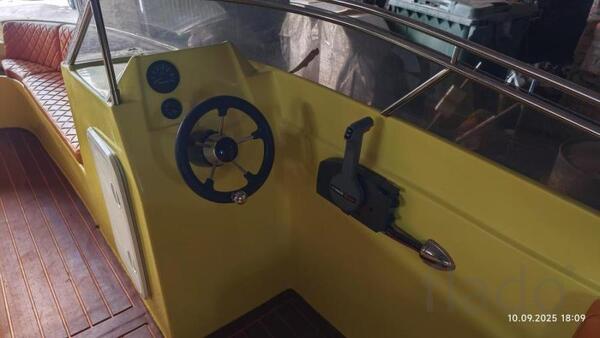 Дополнительно установлены: складной трап из нержавейки (зад, левый борт); помпа водооткачивающая TMS-1000 с установкой; накладка на киль из нержавеющей пластины 30х3 мм длиной 3000 мм для защиты от повреждений; гидравлическое рулевое управление с рулем 250-280 мм и лентяйкой; люк в пост управления сбоку (60*40 см, черный или белый); покрытие палубы искусственным тиком для антискольжения; стойка буксировочная нержавеющая D-57х5 H-1300 мм; топливный бак 140 л из пропилена с указателем уровня; пошив салона в стиле ромб; аккумулятор Marine 105 Ач 700 A; привальный брус нержавеющий D-32.