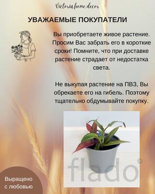 Окраска листьев - зеленая, бордовая, пурпурная, розовая. Важно: может менять оттенок от зеленого до розового/бордового при ярком свете;